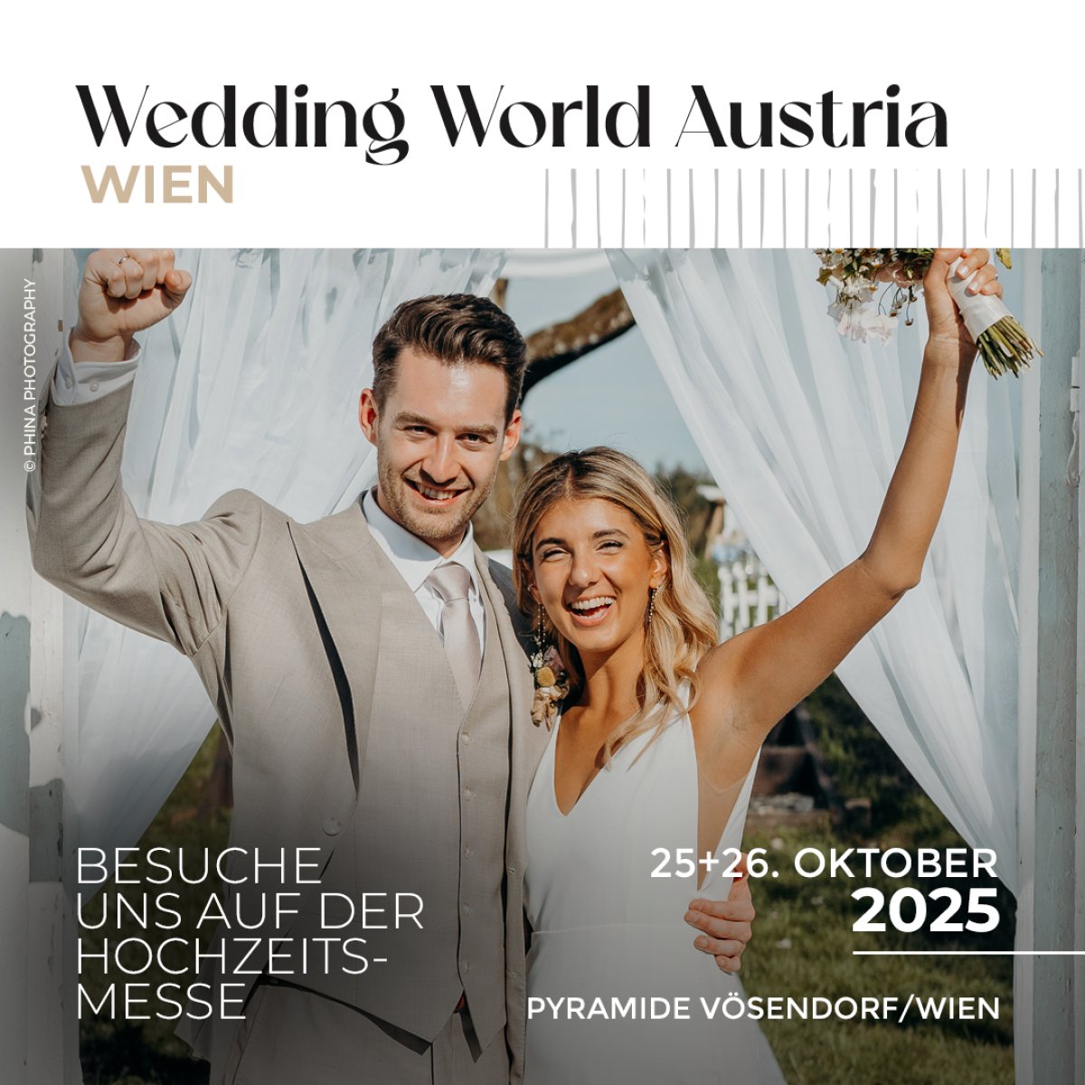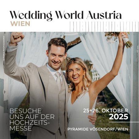 Besuchen Sie uns am 25. und 26. Oktober 2025 auf der Wedding World Wien in der Pyramide Vösendorf. Wir freuen uns auf viele zukünftige Brautpaare! Ihr MÄRCHENHOCHZEITS-TeamHochzeitsmesse